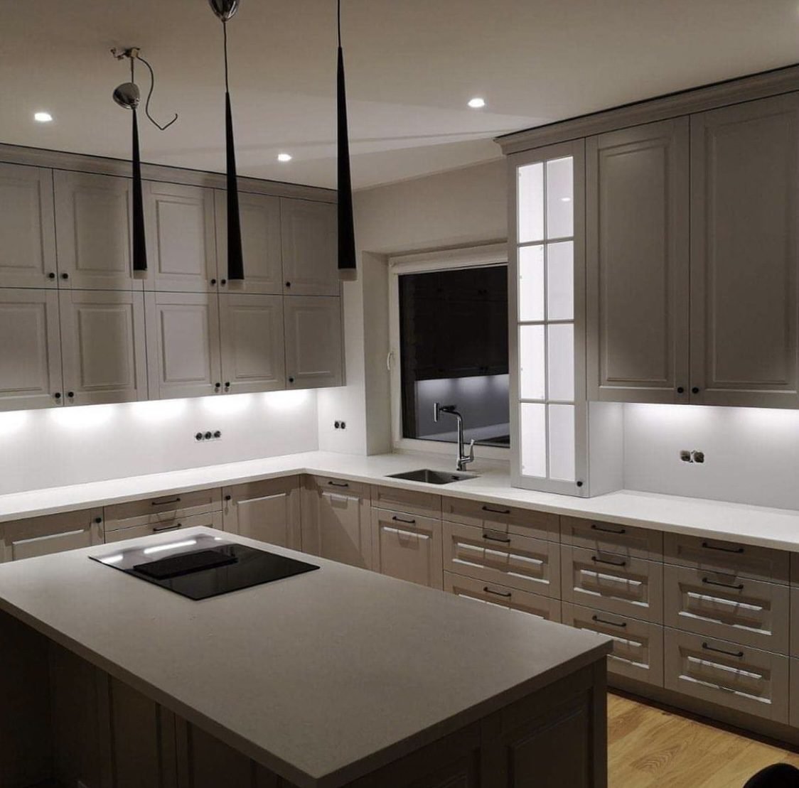 God belysning er avgjørende for et funksjonelt kjøkken. Vi planlegger og installerer arbeidslys under overskapene, stemningsbelysning og generell takbelysning. Riktig plasserte lyskilder gjør matlagingen enklere og skaper en innbydende atmosfære i rommet.